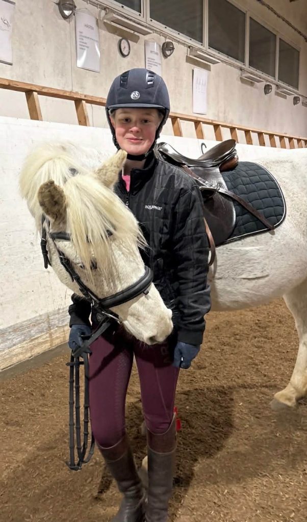 Jag heter Astrid och är 15 år. Jag är oftast i stallet på måndagar när jag rider dressyr för Carina, men även på andra dagar, som torsdagar och fredagar.