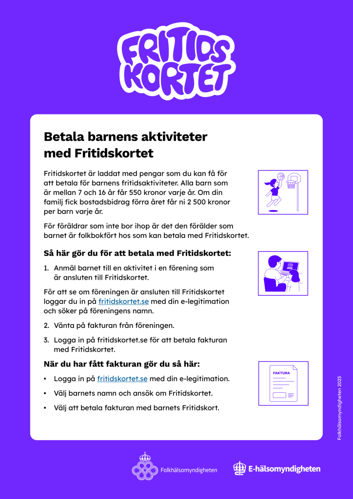 Tänk också på att Fritidskortet behöver användas innan fakturan är helt betald. Om hela fakturan redan är betald går det tyvärr inte att använda Fritidskortet i efterhand. Man kan inte heller använda Fritidskortet för att betala medlemsavgiften till klubben.