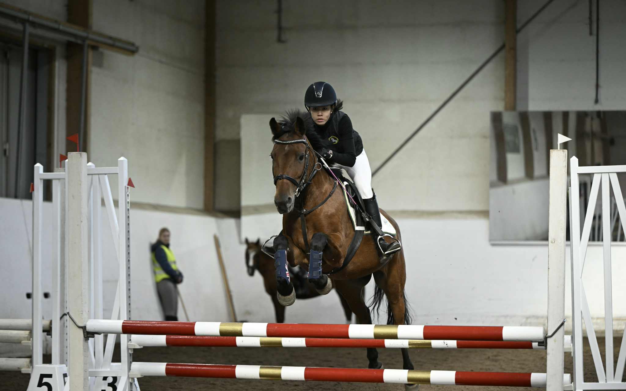 ”Mary är ett sto ponny som kom till oss i oktober 2024 tillsammans med Fancy. Hon är en ponny med tryggt temperament och har inga problem att gå i täten. Mary har oftast mycket spring i benen och det gäller att hitta rätt läge med henne. Taggar till när bommarna kommer fram! Trots farten har hon sten koll på vad hon gör- tycker hon själv. Snäll i all hantering. – Lema, personal och elev”